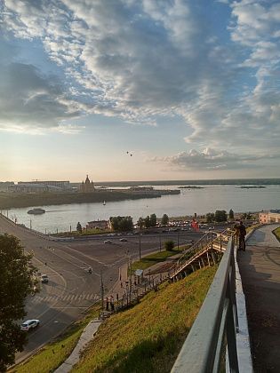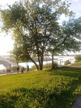 Собственно, все это я оббежала за один день прошлым летом, совершив небольшую прогулочную остановочку, намеренно следуя с пересадками из СПб в Екб. Доверила Яндексу построить обратный пеший маршрут из центра Нижнего Новгорода на вокзал. Навигатор решил, что лестниц было мало – колени еще сгибаются – надо больше, и повел какими-то подворотнями, точнее заворотнями. Буквально в центре города за забором отеля «Азимут» гигантский как будто бы карьер, который местные обходят по верху, а Яндекс заставил спуститься вниз по разрушенной и заросшей крапивой и репейником лестнице, на не менее заросшую тропинку. Без освещения, какие-то кусты – славное укрытие для маньяков. То, что местные обходят это место, поняла по, во-первых, отсутствию людей, во-вторых, из середины ямы увидела такую же разрушенную и заросшую сорняком лестницу наверх впереди тропинки, пустую, в-третьих, пешеходный мост, соединяющий две половины этой низины, и толпы людей на нем. Но снизу открывался красивый вид уже в предзакатные часы, поэтому было несильно обидно.