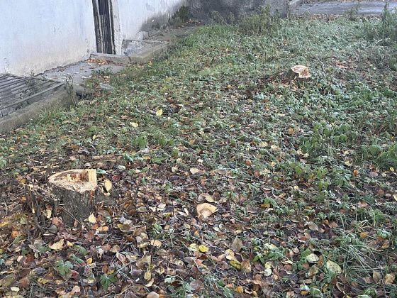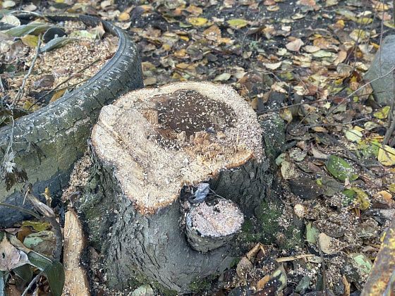 21 и 22 октября во дворе пятиэтажного дома 21а на улице Карпинского, в котором 70 квартир, спилили деревья. На местах, где раньше росли яблони и березы, остались пни и опил.