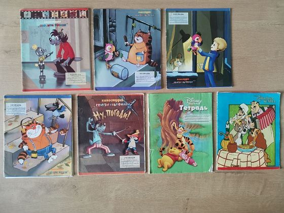 Целая серия тетрадей, посвященных киностудии «Союзмультфильм» – попугай Кеша, заяц и волк из «Ну, погоди!». Персонажи диснеевских мультиков тоже нашли отражение на тетрадях.