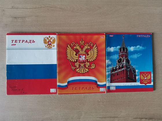 Были тетради с государственными символами – гербом России, флагом, изображением Спасской башни московского Кремля. На тыльной стороне у них и печатали текст гимна.