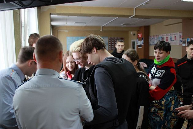Георгий Резников рассказал ребятам о работе дежурной части и показал специальные средства, применяемые сотрудниками полиции. Студенты получили возможность примерить защитные каски и бронежилеты.