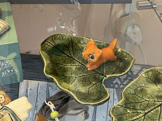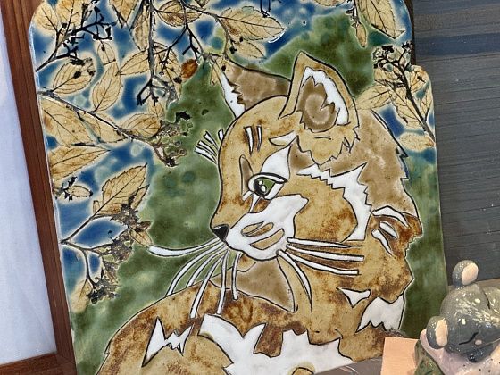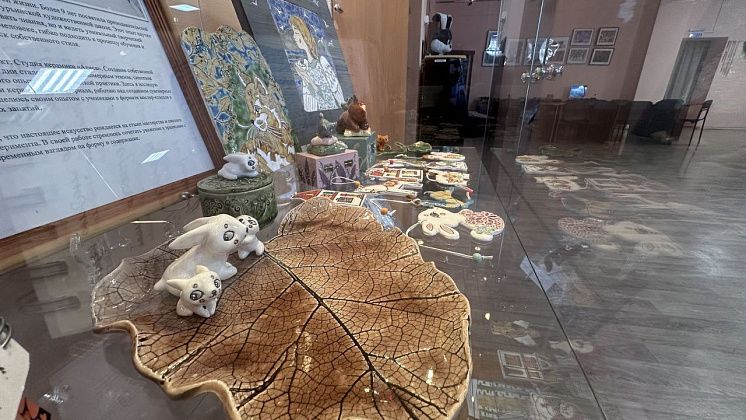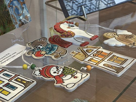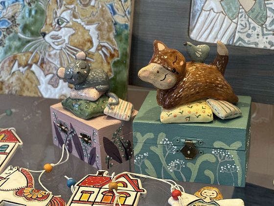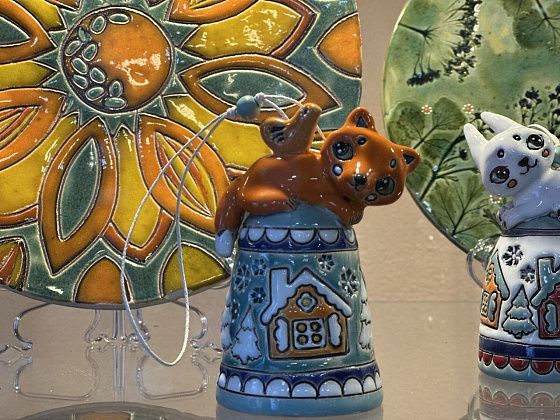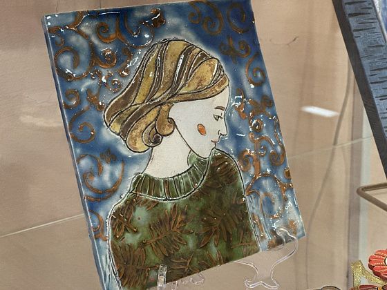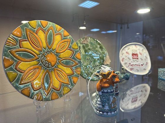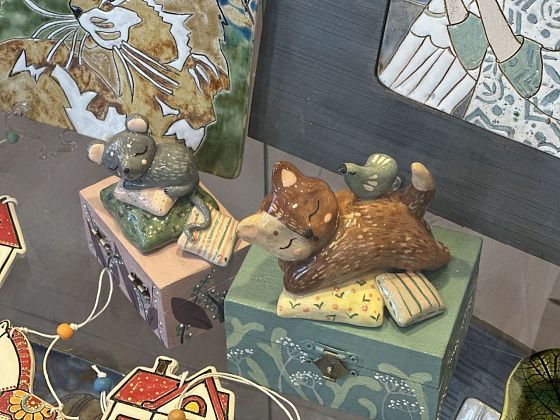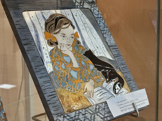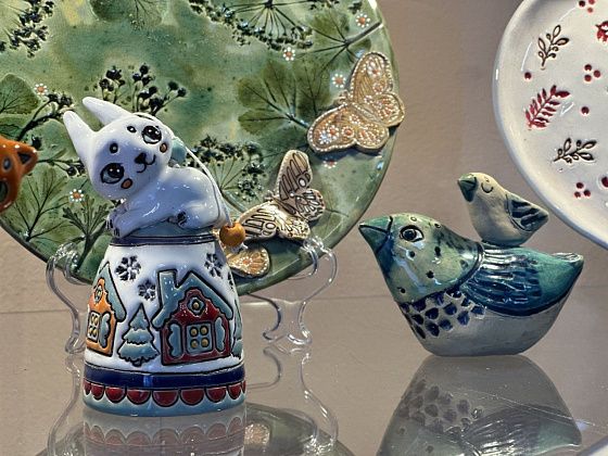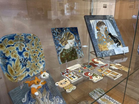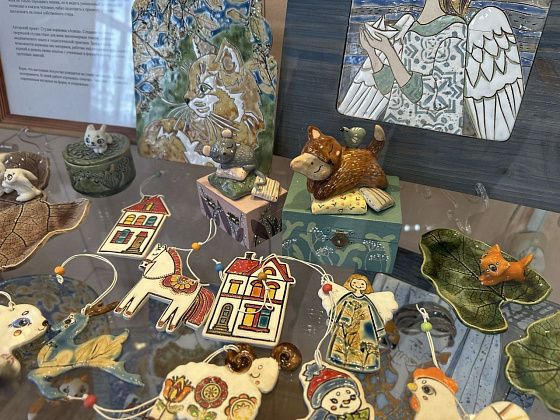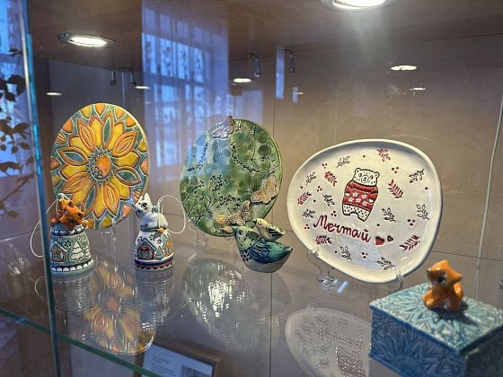 В библиотеке организована выставка работ Виктории Приходько. Среди них есть колокольчики, фигурки, блюдца и панно. Сама мастерица отмечает, что больше всего любит создавать панно и планирует увековечить картины своей мамы, переведя их на керамику и покрыв глазурью.