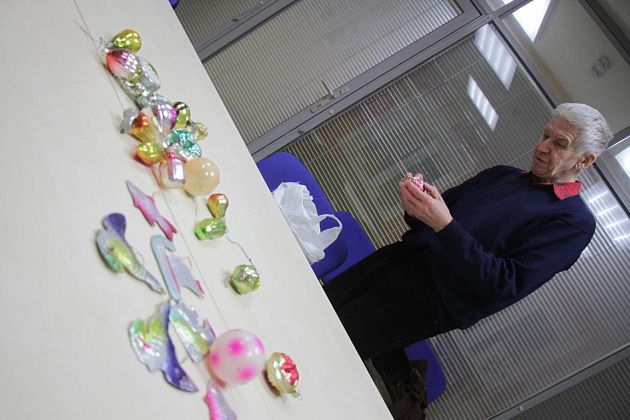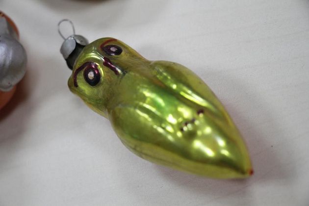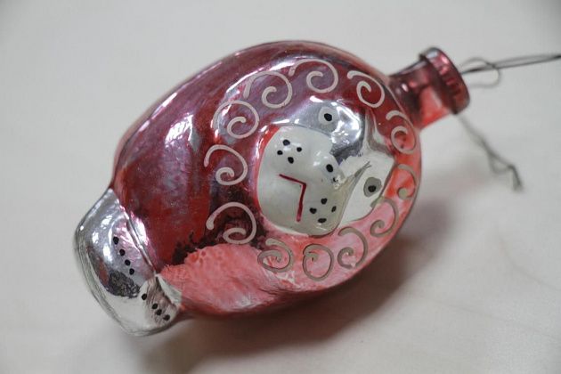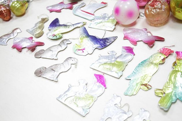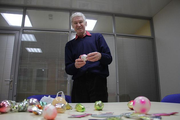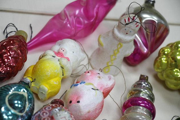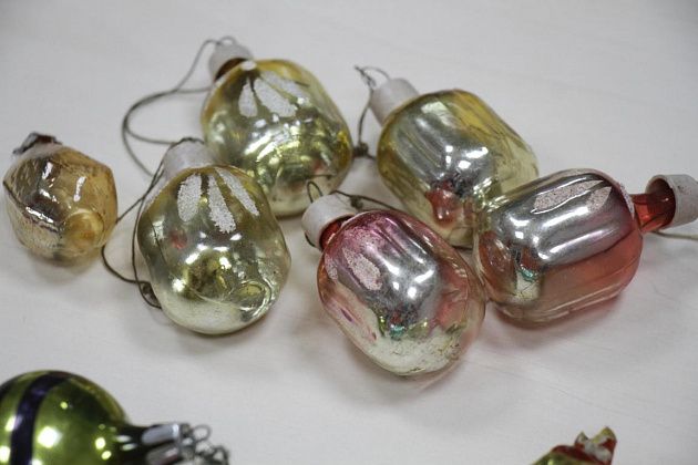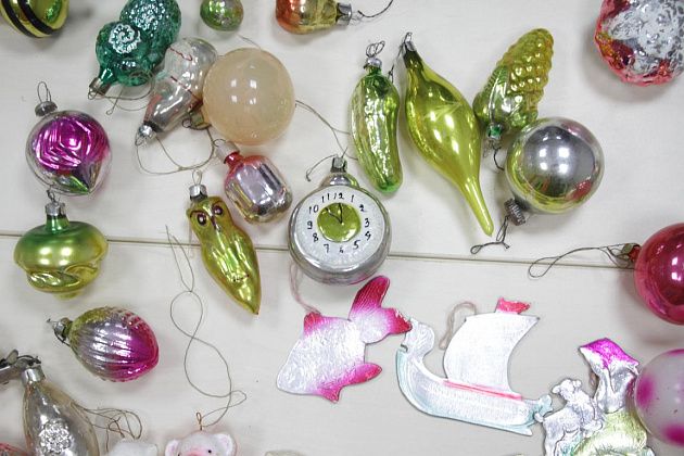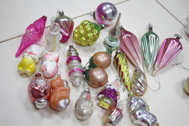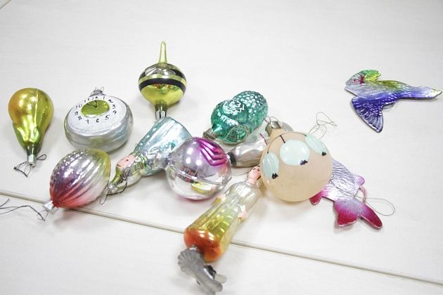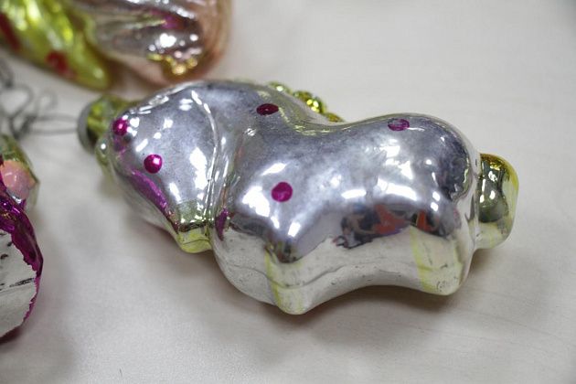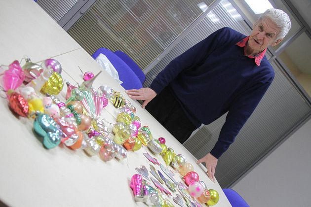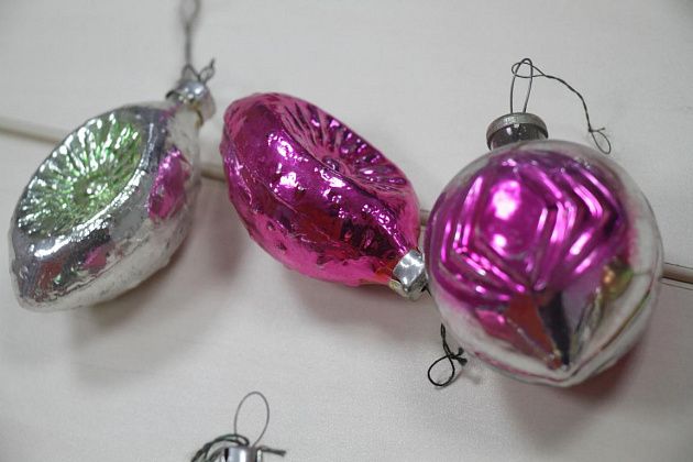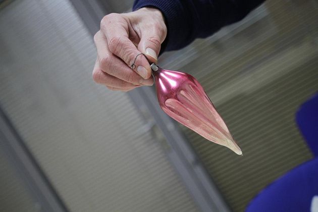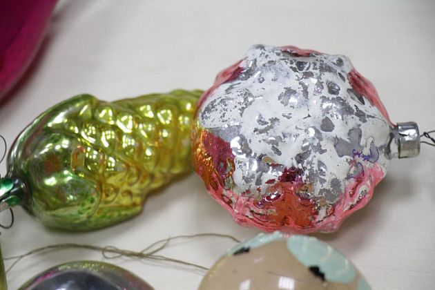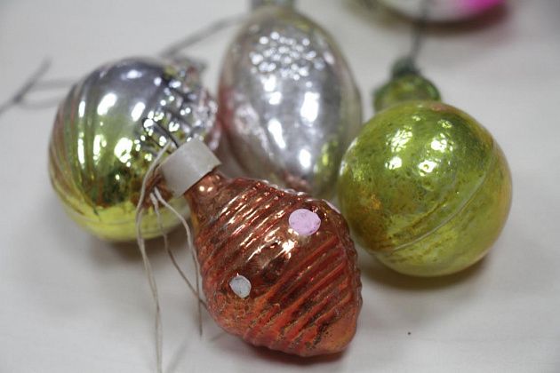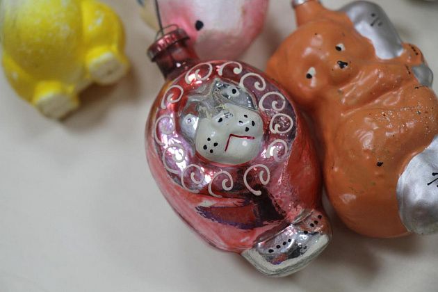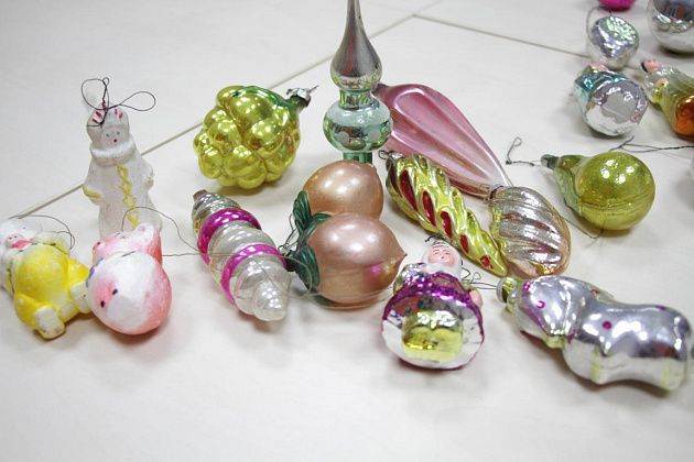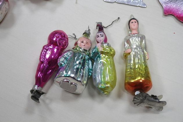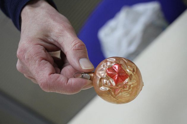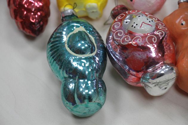Фомичев продолжает извлекать из пакета игрушки 50-х годов. Их легко отличить от более поздних – при их изготовлении использовались немного другое стекло и краски.