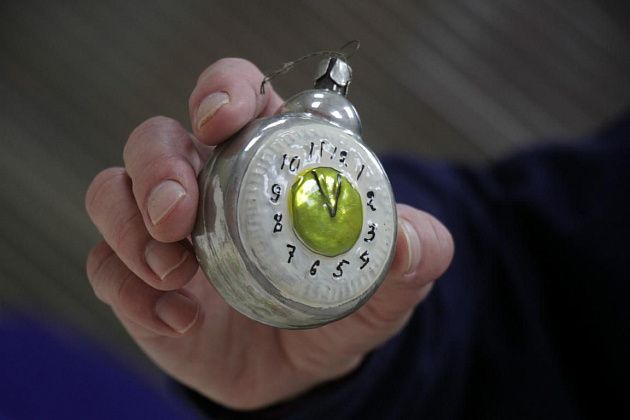 Стеклянные часы, стрелки на которых застыли в положении без 5 минут 12, - одна из любимых елочных игрушек Игоря Фомичева. Фото: Константин Бобылев, "Глобус"